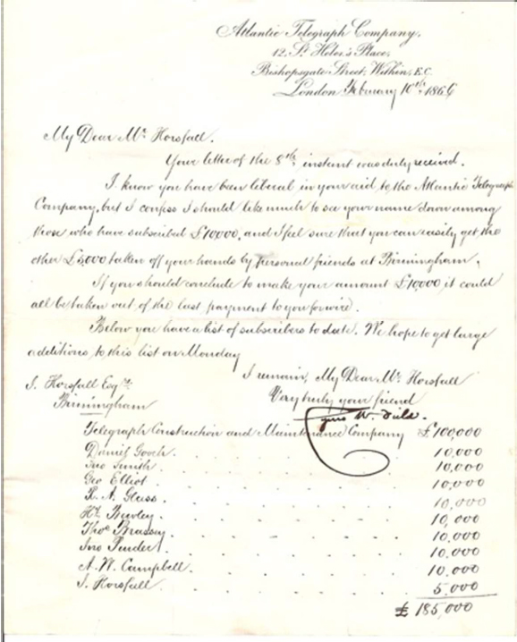 Webster & Horsfall wire used in the first successful Transatlantic Telegraph Cable, marking early innovation impact.